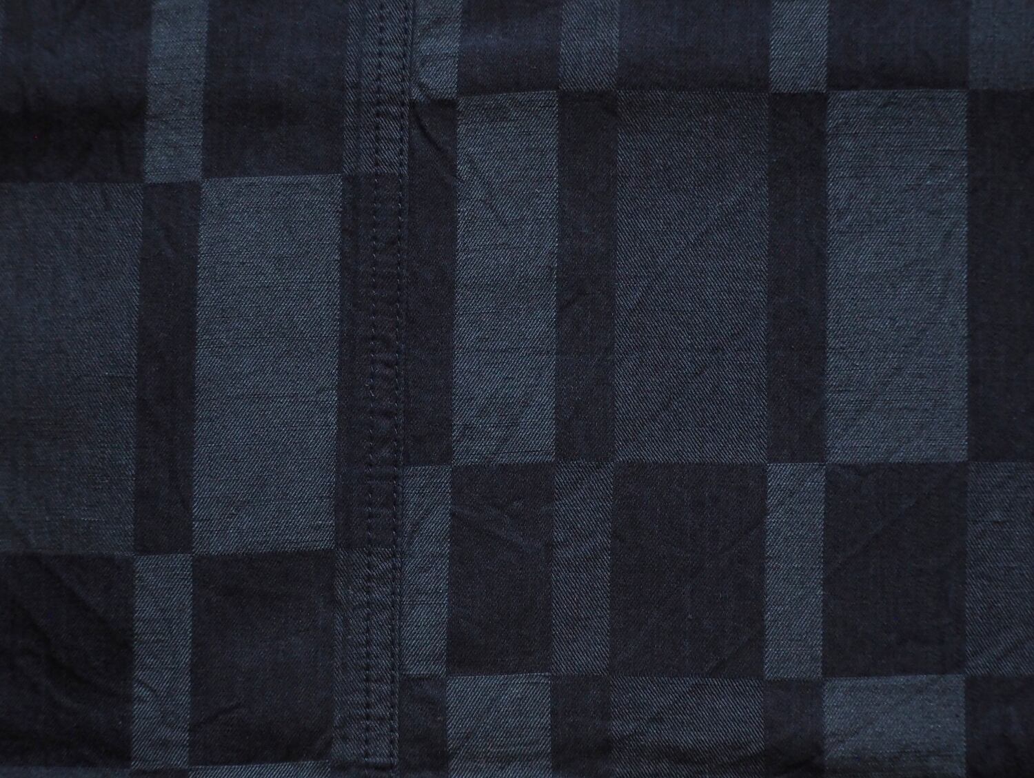 ジャガード織のデニム地を、京都の熟練した染職人が1枚1枚丁寧にどぼん染(浸染)を施しました。